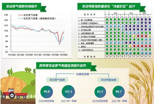 2020年三季度,在各项支农惠农政策的积极作用下,我国农业经济持续向好,基本恢复至疫情前水平,种植结构持续优化,生猪产能持续恢复,农业投资快速增长,农产品贸易持续改善,农民收入稳定增长。从未来预期看,四季度农业景气有望延续回升态势;明年一季度,由于疫情造成同比基数较低的影响,景气指数会有明显回升。