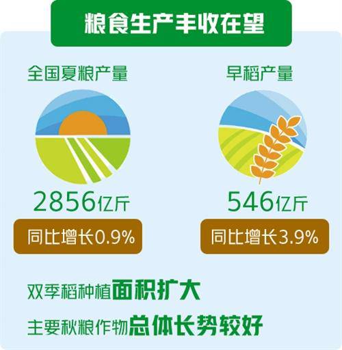粮食生产丰收在望。前三季度,农业(种植业)增加值同比增长3.8%,增速与上半年持平,其中三季度增长3.9%。夏粮早稻实现增产增收。全国夏粮早稻产量合计3402亿斤,其中全国夏粮产量2856亿斤,增加24.2亿斤,同比增长0.9%;早稻产量546亿斤,增加20.6亿斤,同比增长3.9%,扭转了连续多年下降的趋势。秋粮丰收在即。今年我国加大双季稻种植补贴支持力度,双季稻种植面积扩大,为粮食丰收奠定了基础。与此同时,主要秋粮作物总体长势较好,秋粮生产有望再获丰收。粮食种植结构也在持续优化,优质小麦、优质稻谷种植面积进一步扩大,大豆播种面积持续增加。据农业农村部预计,全年粮食产量有望保持在1.3万亿斤以上,将再创历史新高。
