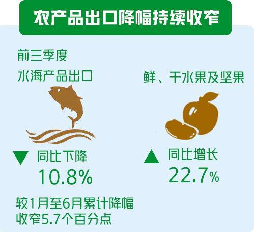前三季度,我国农产品出口额为544.4亿美元,同比下降2.7%,降幅比上半年收窄1.0个百分点,连续2个季度收窄。
