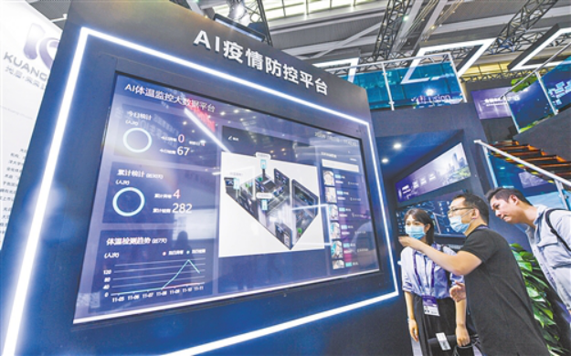 在深圳举行的第二十二届高交会上,各家企业展示的抗疫科技成为一大亮点。疫情防控平台、新冠病毒核酸检测实验室设备仪器、智能服务机器人等吸引了大量参观者和采购者驻足。图为观众在云天励飞展台了解AI疫情防控平台。新华社记者毛思倩摄