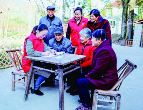 浙江长兴县和平镇方家庄村便民服务中心党员志愿者为村里的老年人上门办理第三代社保卡换证业务。新华社发