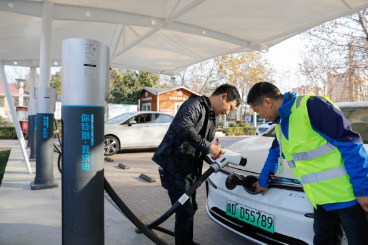 2021年11月26日,在河南省宝丰县龙兴湖公园,市民使用充电桩为新能源车充电。 新华社发(何五昌 摄)