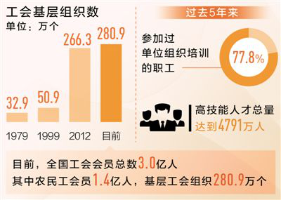 现阶段,全国工会会员总数3.0亿人,其中农民工会员1.4亿人,基层工会组织280.9万个,覆盖单位655.1万个。改革结出的累累硕果,正让中国工会——这个世界上最大的工会组织越来越充满活力。