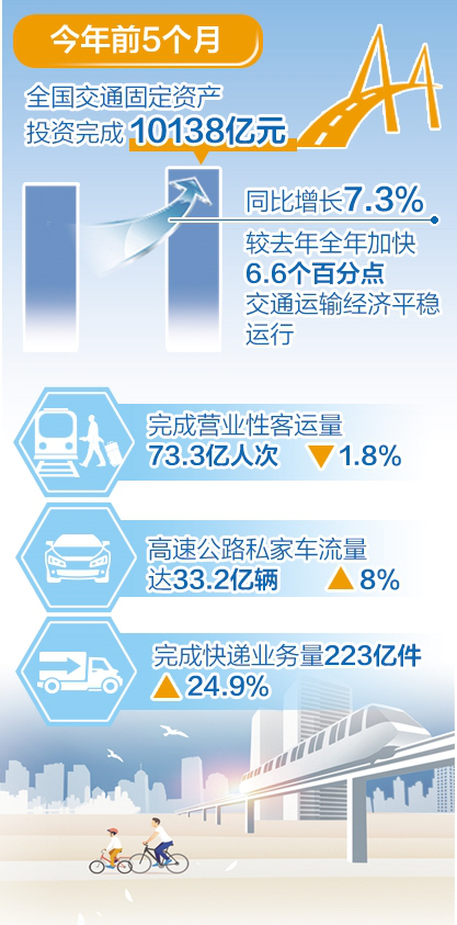 “今年以来,交通运输部大力促进交通有效投资,通过提前下达车购税资金、积极争取收费公路专项债额度、加快项目审批等措施,确保交通固定资产投资高位运行。”吴春耕介绍说,1月份至5月份,交通固定资产投资保持较快增长,完成投资10138亿元,同比增长7.3%,较去年全年加快6.6个百分点。其中,公路水路完成投资7537亿元;铁路完成投资2244亿元,同比增长12.6%;民航建设完成投资357亿元,同比增长39.5%。