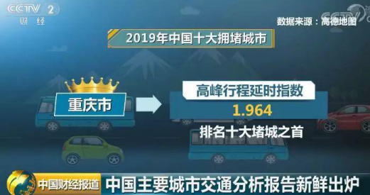 报告显示,2019年中国十大拥堵城市分别是重庆市、哈尔滨市、北京市、长春市、呼和浩特市、大连市、济南市、沈阳市、兰州市、西宁市。其中,重庆市高峰行程延时指数为1.964,排名十大堵城之首。