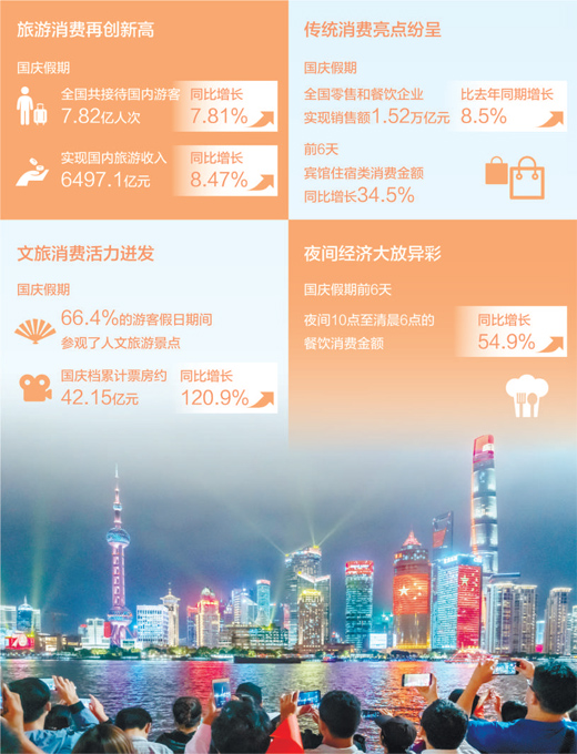 多项消费数据再创新高。10月1日至7日,实现国内旅游收入6497.1亿元,同比增8.47%;国庆档票房约42.15亿元,较去年的19.08亿元,同比增长120.9%。亮眼的消费数据,正是中国澎湃消费动力的生动注解。