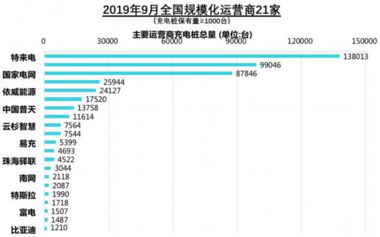 从运营商角度来看,集中度也较高。截止到2019年9月,全国充电运营企业所运营充电桩数量超过1万台的共有8家,分别为:特来电运营13.8万台、星星充电运营9.9万台、国家电网运营8.8万台、云快充运营2.6万台、依威能源运营2.4万台、上汽安悦运营1.8万台、中国普天运营1.4万台、深圳车电网运营1.2万台。这8家运营商占总量的89.7%,其余的运营商占总量的10.3%。
