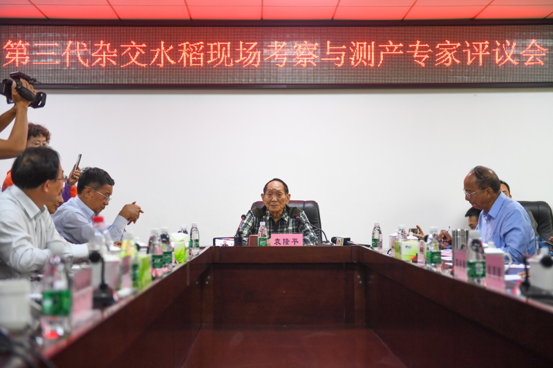 10月22日,袁隆平(中)在第三代杂交水稻现场考察与测产专家评议会现场。新华社记者 陈泽国 摄
