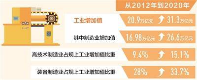 ——制造业产业结构加快升级。高技术制造业占规模以上工业增加值比重从2012年的9.4%提高到2020年的15.1%;装备制造业占规模以上工业增加值比重从28%提高到33.7%。技术改造投资占工业投资比重提高到47.1%,新技术、新材料、新装备、新工艺广泛应用,规模以上工业企业新产品销售收入占主营业务收入比重提高到20%左右。