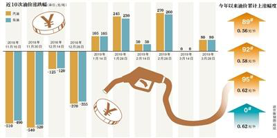据新京报记者统计,本轮油价上涨之后,今年以来我国汽油、柴油每吨总上调幅度已分别达750元及725元。与2018年年末相比,此次上调之后,每升89号汽油累计涨价0.56元、92号汽油涨价0.58元、95号汽油涨价0.62元、0号柴油则涨价0.62元。