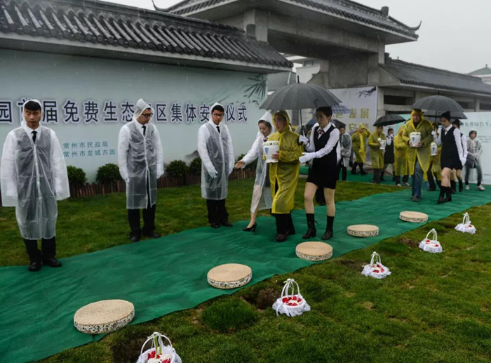 4月2日,在江苏常州市龙城古园生态葬安葬仪式上,家属准备安葬亲人 季春鹏 摄