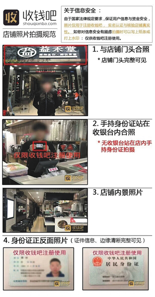 6月2日,记者在“收钱吧”官网填写了商户开通申请并咨询客服人员后,一位员工提出加记者微信沟通。该员工告诉记者,开通需要五份材料:申请人身份证正、反面照片,申请人与店铺门头合照一张,店铺内景照一张,申请人在店里手持身份证拍一张照,以及收款银行卡的正面照片。