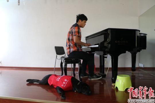 岳雷在家弹钢琴时,导盲犬芬丽在一旁安静陪伴。本组照片由中国青年报·中青在线记者 王海涵/摄