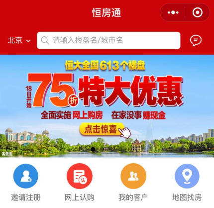2月13日,恒大宣布在全国所有楼盘实行网上售卖,为购房者提供网上”看房+选房+认购”的一站式服务,以及最低价购买、无理由退房、多重购房优惠等权益。此外,恒大还出台了针对兼职销售员的激励政策,兼职销售员通过邀请好友以及推荐成交,就可以赚取佣金和奖励。