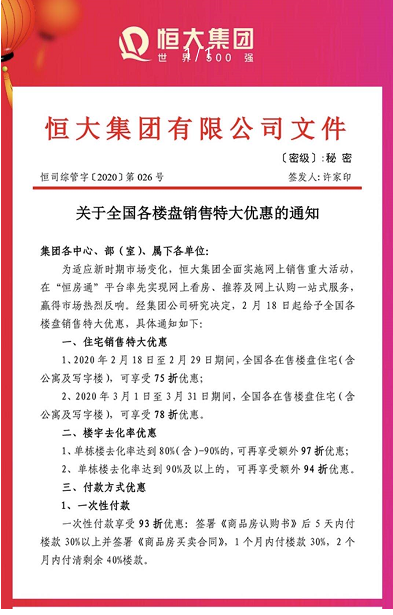 当日晚间,恒大又加推新政策,从2月18日至2月29日期间,全国各在售楼盘住宅(含公寓及写字楼),可享受75折优惠;2020年3月1日至3月31日期间,全国各在售楼盘住宅(含公寓及写字楼),可享受78折优惠。据悉,这是恒大历史上力度最大的一次优惠让利。