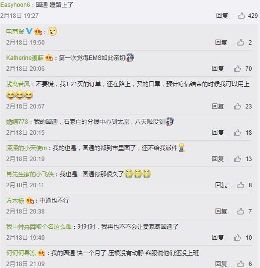 网友“满杯甜酒椰”发布微博称,“我十天没动的韵达是不是可以更新一下物流惹”;网友“啵霸兔兔果茶”说,“圆通快递怕是消失了,送个东西几天不动一下”;网友“啊啊啊喵在等待”则调侃,“等中通快递把我的口罩寄到了,疫情也快结束了吧”。