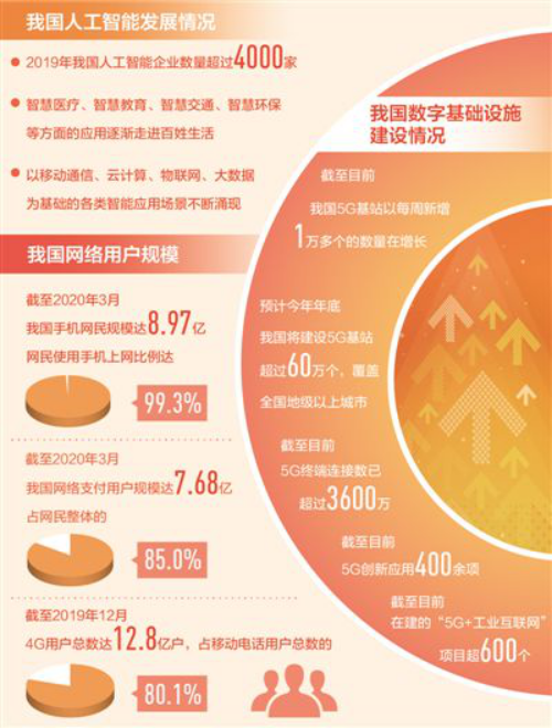 机器人当快递员、企业家做直播主播、健身教练云端授课……层出不穷的互联网新技术新应用新业态,正深刻地改变着人们的日常生活。近年来,我国互联网发展动能越发强劲,发展空间更加广阔。根据《第45次中国互联网络发展状况统计报告》,截至今年3月,我国手机即时通信用户规模达8.90亿;在4G已经普及的情况下,预计今年年底,我国将建设5G基站超过60万个,覆盖全国地级以上城市;我国在人工智能、大数据、互联网基础资源等领域自主创新能力不断增强,产业融合加速推进。