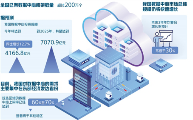 今年,我国明确要加快5G网络、数据中心等新型基础设施建设进度,各地还将继续上马一批数据中心建设项目。数据中心市场总体规模将快速增长,未来3年年均复合增长率预计不低于30%。专家建议,各地在布局数据中心时,要根据应用需求,科学规划、统筹布局,避免“一哄而上”导致无效投资。