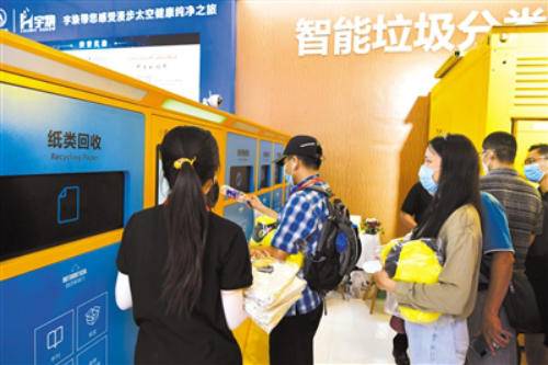 可回收垃圾兑换积分或环保金、垃圾桶满载后骑手须在十分钟内抵达处理、垃圾清运后直接分拣进入后端处理厂商。服贸会上,一组明黄色智能垃圾分类小屋吸引了不少市民的关注。据介绍,这一套系统实现从前端投放到后端处理的垃圾分类全流程,运用大数据平台实现全程督导。