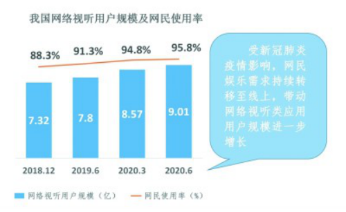 《报告》显示,截至2020年6月,我国网络视听用户规模达9.01亿,较2020年3月增长4380万,网民使用率为95.8%,人均单日使用时长达110分钟。在网络视听产业中,短视频的市场规模占比最高,达1302.4亿元。在抖音、快手等短视频平台的加速渗透下,我国短视频用户规模已达8.18亿,占整体网民的87.0%。
