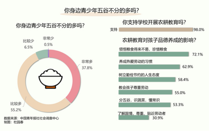 近日,中国青年报社社会调查中心联合问卷网(wenjuan.com),对2003名受访者进行的一项调查显示,93.0%的受访者感到身边五谷不分的青少年多。95.7%的受访者认为对青少年开展农耕教育,有利于他们长大后参与乡村振兴。71.9%的受访者希望学校在春耕、秋收等季节,带学生参与劳动体验。