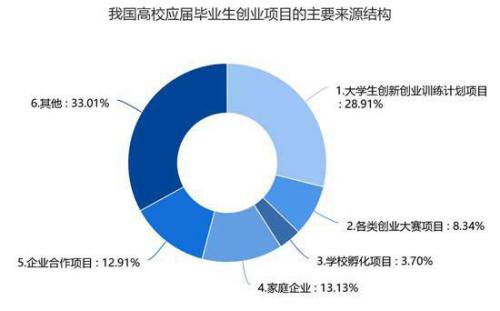 在已有创业项目的毕业生中,其创业项目的主要来源结构为:其他(33.01%)、大学生创新创业训练计划项目(28.91%)、家庭企业(13.13%)、企业合作项目(12.91%)、各类创业大赛项目(8.34%)、学校孵化项目(3.70%)。课题组进一步对选择“其他”项的毕业生展开追踪访谈,发现“其他”主要集中于“网络宣传项目”“朋友合伙项目”等。