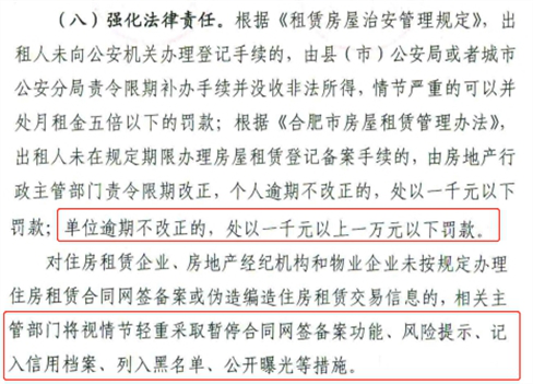 其中,合肥、深圳、秦皇岛三地对“不按时登记备案”设有处罚。比如合肥,不仅会对未在规定期限办理房屋租赁登记备案手续、且逾期不改正的个人和单位罚款,还会对未按规定办理住房租赁合同网签备案的住房租赁企业、房地产经纪机构和物业企业采取记入信用档案、列入黑名单等惩罚措施。