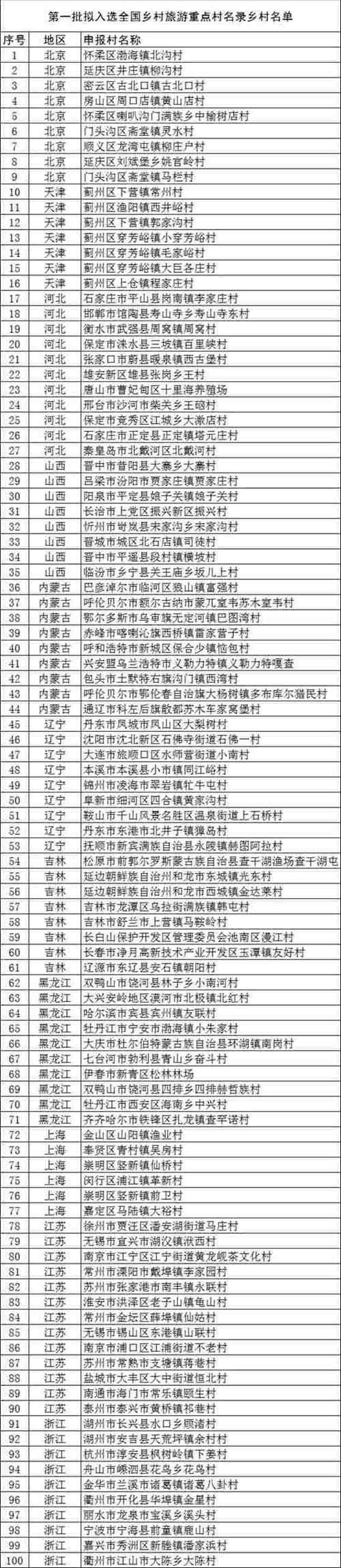 会上还发布了由文化和旅游部、国家发展和改革委员会确定的第一批全国乡村旅游重点村名单,全国共有320个村庄榜上有名。记者在重点村名单中发现,包括北京密云区古北口镇古北口村、广西桂林市灵川县大圩镇袁家村、湖南湘西土家族苗族自治州花垣县双龙镇十八洞村、安徽宣城市广德县太极洞风景区桃园村、河北保定市涞水县三坡镇百里峡村等知名旅游村均在此次发布的名单中,而乡村旅游起步较早的江浙地区、川渝地区均有不少乡村入选,如江苏、浙江两省的入选村便有27个。