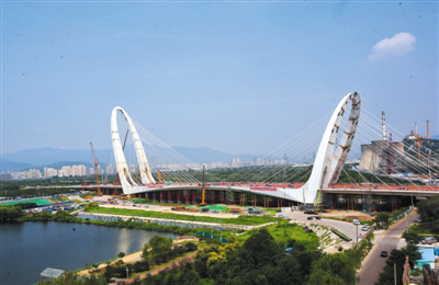 昨天上午,记者在新首钢大桥的施工现场看到,大桥横跨永定河而立,向北可以远眺园博园中具有辽金风貌的永定塔,南边则紧邻冬奥会比赛场馆之一的首钢滑雪大跳台,寓意“和力之门”的两座钢塔已经完全建成,桥面上有部分工人在进行最后的收尾工作。