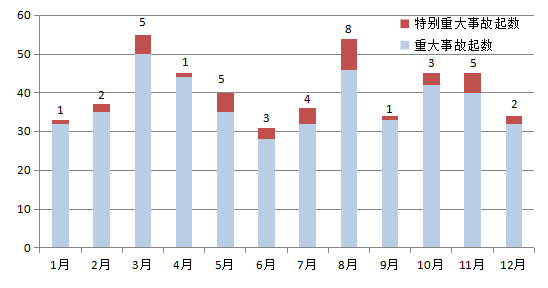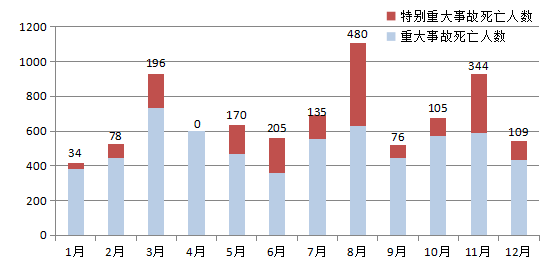 其中,特别重大事故在近十年的8月份发生最为集中,共发生8起、死亡480人,占近十年特别重大事故起数、死亡人数的20.0%、24.8%;分别比全年月平均值高出11.7和16.5个百分点,在12个月份中均位列第一位。
