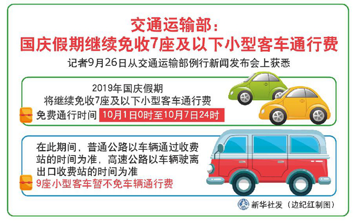 新华社北京9月26日电(记者魏玉坤)记者26日从交通运输部例行新闻发布会上获悉,今年国庆假期,将继续免收7座及以下小型客车通行费,免费通行时间为10月1日0时至10月7日24时,在此期间,普通公路以车辆通过收费站的时间为准,高速公路以车辆驶离出口收费站的时间为准。9座小型客车暂不免车辆通行费。