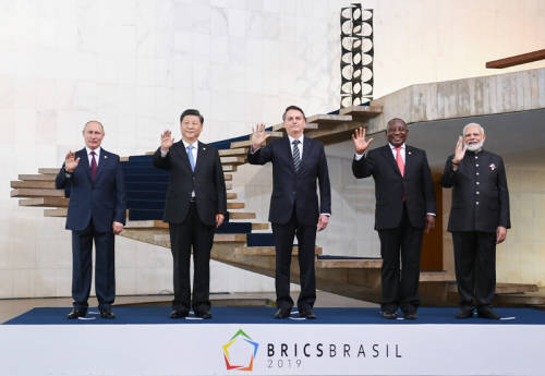 2019年11月14日,金砖国家领导人第十一次会晤在巴西首都巴西利亚举行。巴西总统博索纳罗主持会晤。中国国家主席习近平、俄罗斯总统普京、印度总理莫迪、南非总统拉马福萨出席。五国领导人围绕“经济增长打造创新未来”主题,就金砖国家合作及共同关心的重大国际问题深入交换意见,达成广泛共识。