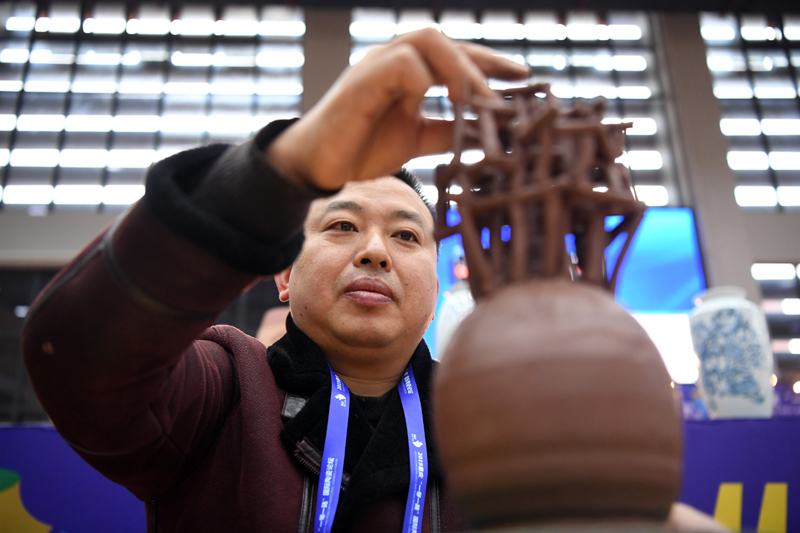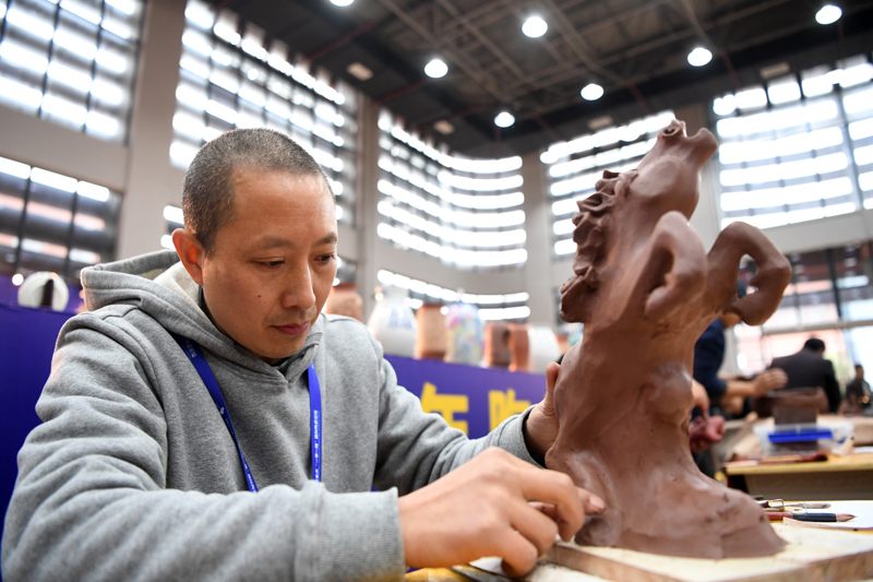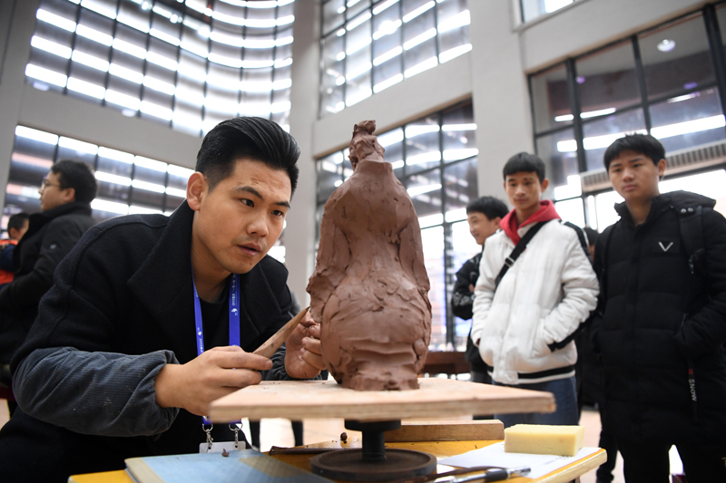 12月1日,参赛选手在陶艺技能大赛现场制陶。