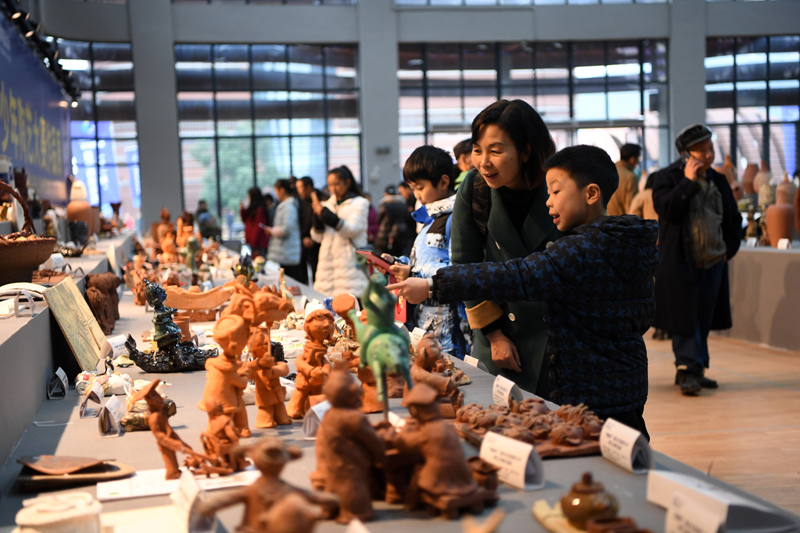 12月1日,一对母子在陶艺技能大赛现场参观参赛作品。
