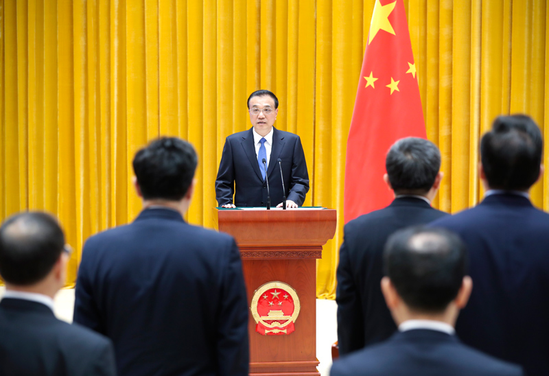 宣誓后,李克强说,忠于宪法、遵守法律是每一名公职人员必须遵循的基本行为准则,让人民过上好日子是每一名公职人员必须谨记的奋斗目标。他要求大家坚持以习近平新时代中国特色社会主义思想为指导,依法履职,为民履职,实干履职,廉洁履职。带头尊法学法守法用法,积极推进改革创新,在攻坚克难中彰显担当,在狠抓落实中展现作为,严守纪律规矩,严格秉公用权,勤俭办事,厉行节约,倾情竭力把人民群众最关切最期盼的事情办实办好,齐心协力推动经济社会持续健康发展。