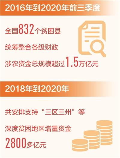 从2020年12月2日举行的国新办新闻发布会获悉:财政部门把脱贫攻坚摆在财政支出优先保障地位,通过创新政策举措,针对性和实效性不断提高。2016—2020年,连续5年每年新增中央财政专项扶贫资金200亿元,2020年达到1461亿元;今年又一次性安排综合性财力补助资金300亿元,支持补齐挂牌督战地区脱贫攻坚短板弱项。2016年到2020年前三季度,全国832个贫困县统筹整合各级财政涉农资金总规模超过1.5万亿元,每个贫困县可支配的财政扶贫资金由整合试点前的年均几千万元,提升到整合试点后的年均超3.6亿元。2018年到2020年共安排支持“三区三州”等深度贫困地区增量资金2800多亿元。