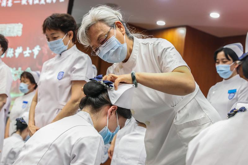 5月10日,北京大学人民医院的护理届前辈闫凤玲(中)为新入职护士授帽。