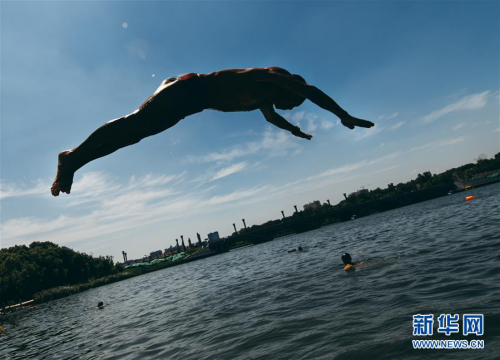 夏日炎炎,一位游泳爱好者跃入水中。新华社记者许畅摄