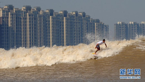一名冲浪高手在钱塘江大潮前冲浪。新华社记者韩传号摄