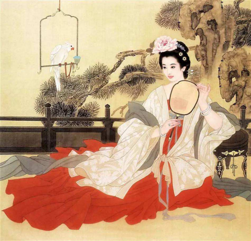 团扇往往与美人同时出现。那一幅幅仕女图中,体态丰腴、衣着华美的仕女们,或谈笑,或静立,或赏花鸟鱼虫,手中必少不得那一团薄雾轻云般的扇。或执扇轻摇,或以扇遮面,无一不体现了仕女的温雅不俗。