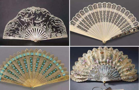 在欧洲人手里,折扇开始“穿金戴银”,他们用黄金、象牙、龟甲、珠母等来做扇骨,而扇面则用蕾丝、绸缎、花边和羽毛、兽皮制成,上面往往还装饰有珍贵的金属和宝石。