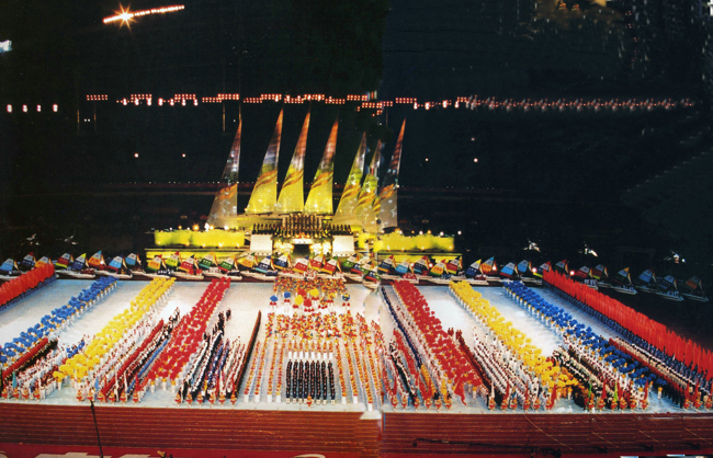 六运会闭幕式上进行会旗交接(来源:《中国十运:1—10届全运会精彩回眸》)