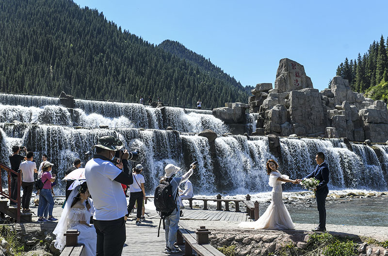 一对新人在天山大峡谷景区拍摄婚纱照(8月9日摄)。