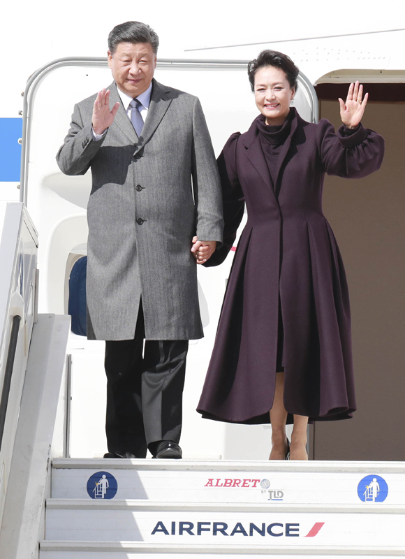 3月25日,国家主席习近平在巴黎爱丽舍宫同法国总统马克龙会谈。当日上午,习近平结束在尼斯的行程,乘专机离开尼斯赴巴黎,继续对法国进行国事访问。这是习近平和夫人彭丽媛抵达巴黎戴高乐机场。新华社记者 丁林 摄