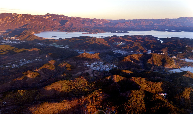 阳光照在北京密云水库旁的山野上(10月30日无人机拍摄)。