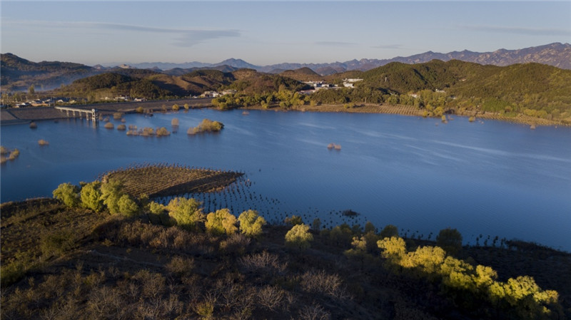 金秋时节,北京密云水库沿岸树林逐渐变黄,山水相映,恬淡宁静。
