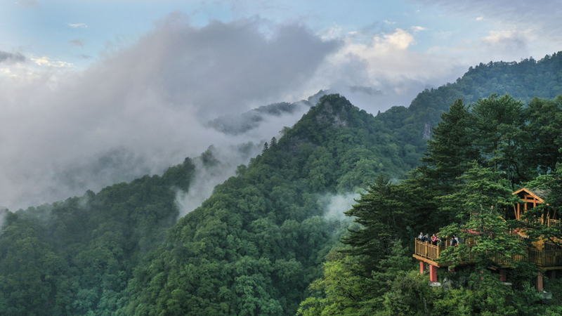 当日,雨后的陕西省略阳县五龙洞国家森林公园云雾缭绕,美若仙境。该公园位于陕、甘、川三省交界处,这里奇峰兀立、争奇斗险,巨树参天、古藤高悬,是户外探险、旅游休闲的好去处。