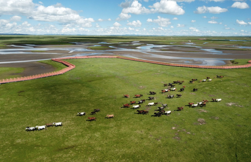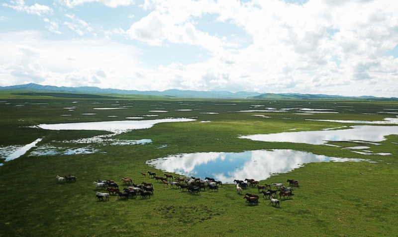 6月22日,在玛曲县河曲马场,几匹河曲马在草原湿地旁奔跑。