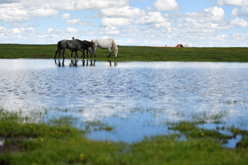 6月22日,在玛曲县河曲马场,几匹河曲马在草原湿地旁觅食休憩。