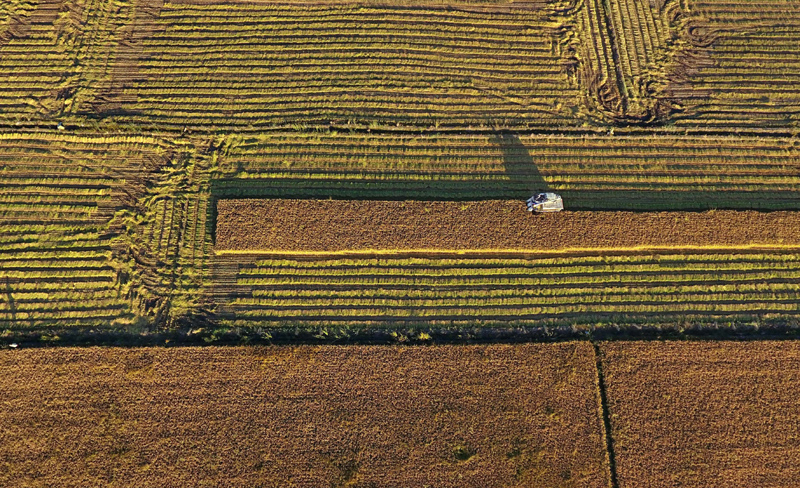 10月8日,唐山海港经济开发区王滩镇的村民在使用收割机收获水稻(无人机拍摄)。